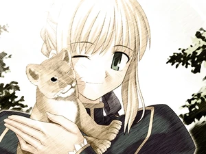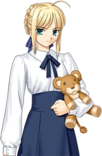For the most part, Artoria is a serious person who fully devotes herself whatever task she's given. This can especially true when it comes to competition, since she's a sore loser, though truthfully her soreness is directed at her own weakness. Normally overly sensitive to others' feelings, Artoria can become obstinate at her worst. She can spend hours on a single task until she's satisfied, such as forcing Shirou and Rin to let her keep playing baseball because she was losing way past scheduled. Her poor sportmanship is nothing compared to her fanatic devotion to her kingly duty though. Other find her devotion disturbing, seeing that she is denying herself of everything for the sake of her duty. She so stubbornly adheres to her duty that she ignores, rejects, and/or actively fights against other's opinions to validate herself. This is most obvious in her fights with Shirou about her past. This tendency to fight others that she disagrees with is compounded by how she is unable to ignore what others say or do. She cares greatly about others' opinions, and their disagreement hurts her greatly; her brother, Kay, compares her heart to a reed in that respect. If someone makes a trangression against her, Artoria is extremely ready to fight, even physically, anyone for that perceived insult. This most often includes Shirou in both serious and comical situations. Shirou implying that Artoria is a human, and not a Servant, is immediately cornered verbally by Artoria. At another time, Shirou is knocked unconscious for teasing her for playing with her lion plushy in Fate/hollow ataraxia.
