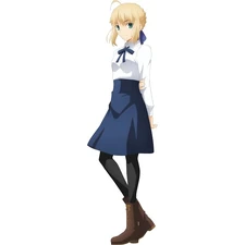 Due to her inability to dematerialize, she needs to wear modern clothing in order to travel in public. Though she can wear her own dress when not in battle, she needs modern clothing to keep from standing out. With the ability to control the materialization of her armor, she can be ready for battle instantly and return to normal without damaging the clothing. During the Fourth Holy Grail War, Irisviel decides to match Artoria's clothing with her own appearance by dressing her as a man.[20] During the Fifth Holy Grail War, Rin Tohsaka prepares clothes for Artoria, a blue, knee-length skirt (with tights) and white shirt (with a blue string tie), and brown boots originally a birthday present to Rin from Kirei Kotomine.[21]